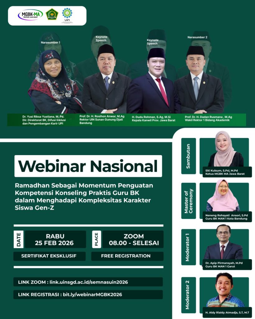 BANDUNG – Menghadapi dinamika pendidikan di era disrupsi, UIN Sunan Gunung Djati Bandung sukses menggelar Webinar Nasional yang diikuti oleh lebih dari 200 Guru Bimbingan Konseling (BK) dari berbagai sekolah dan madrasah di seluruh Indonesia pada Rabu (25/02/2026). Kegiatan virtual melalui platform Zoom ini menjadi ajang krusial untuk menyelaraskan persepsi antara kurikulum sekolah dengan standar kompetensi yang dibutuhkan di perguruan tinggi.